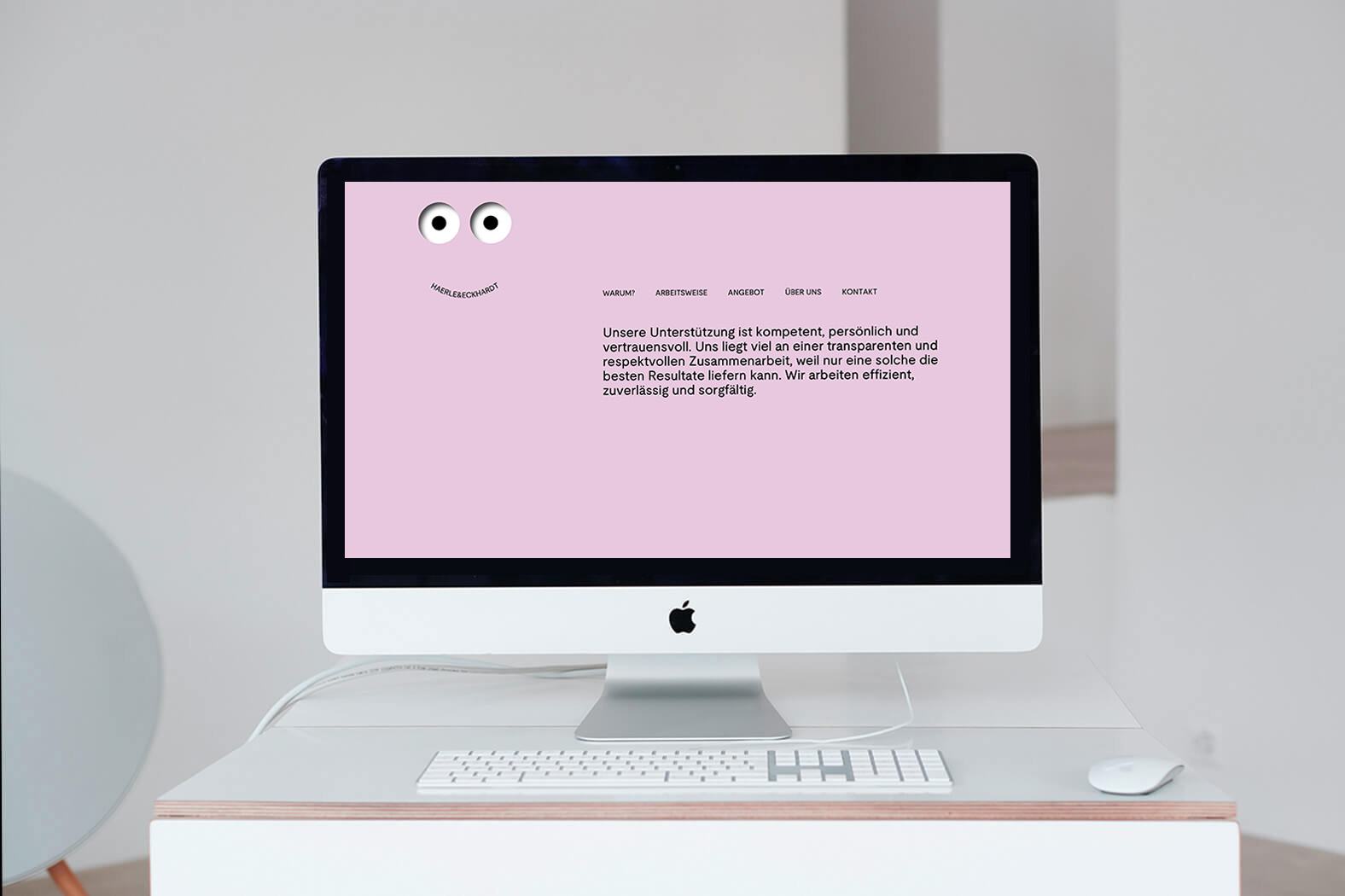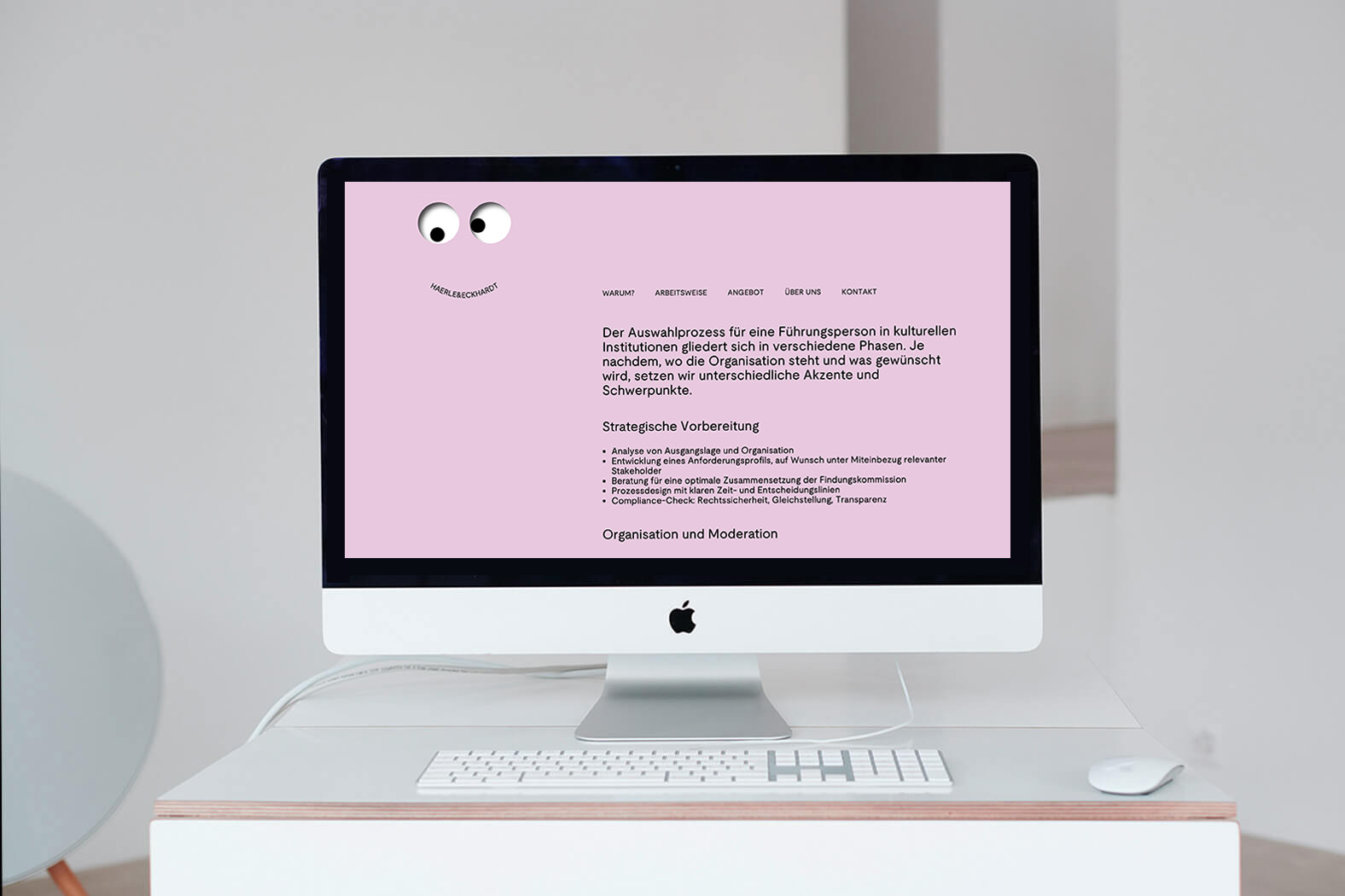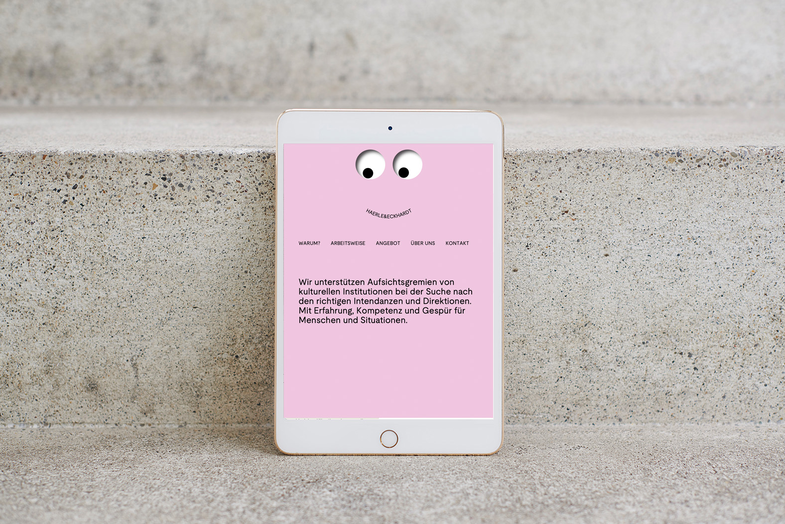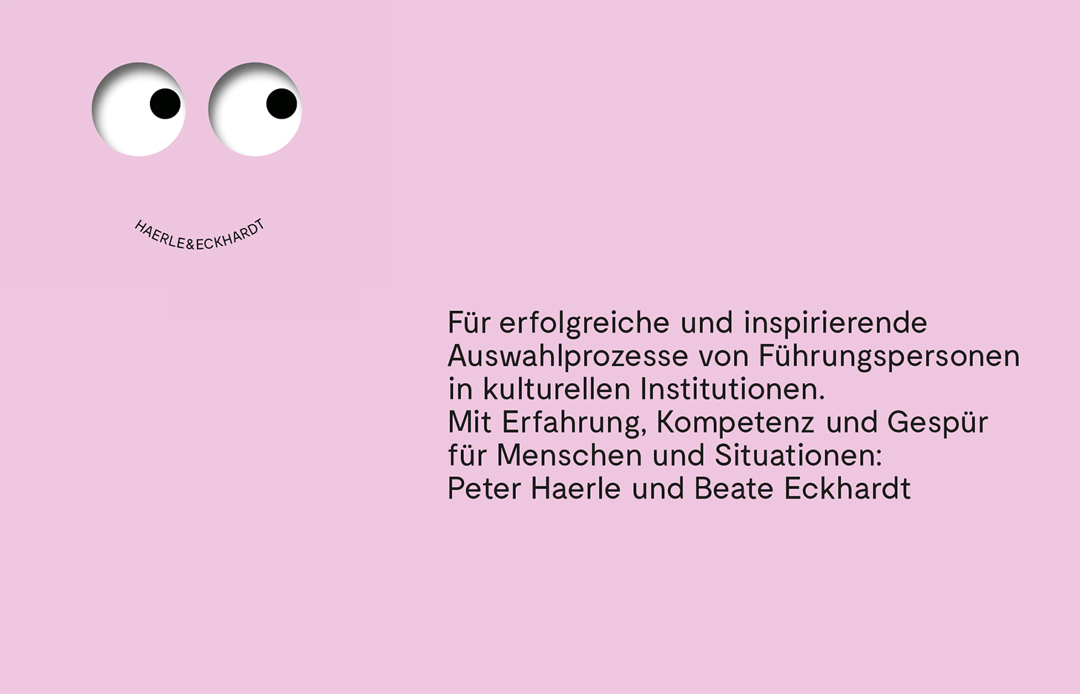 Reduktion pur: Minimalistische Augen-Icons bilden zusammen mit dem Schriftzug eine feine Mimik. Sie leitet durch den Inhalt, sorgt für Interaktion und gibt dem gewichtigen Angebot von HAERLE & ECKHARDT Leichtigkeit. Entstanden ist eine visuelle Sprache, die Vertrauen schafft, Haltung zeigt und zum Dialog einlädt.