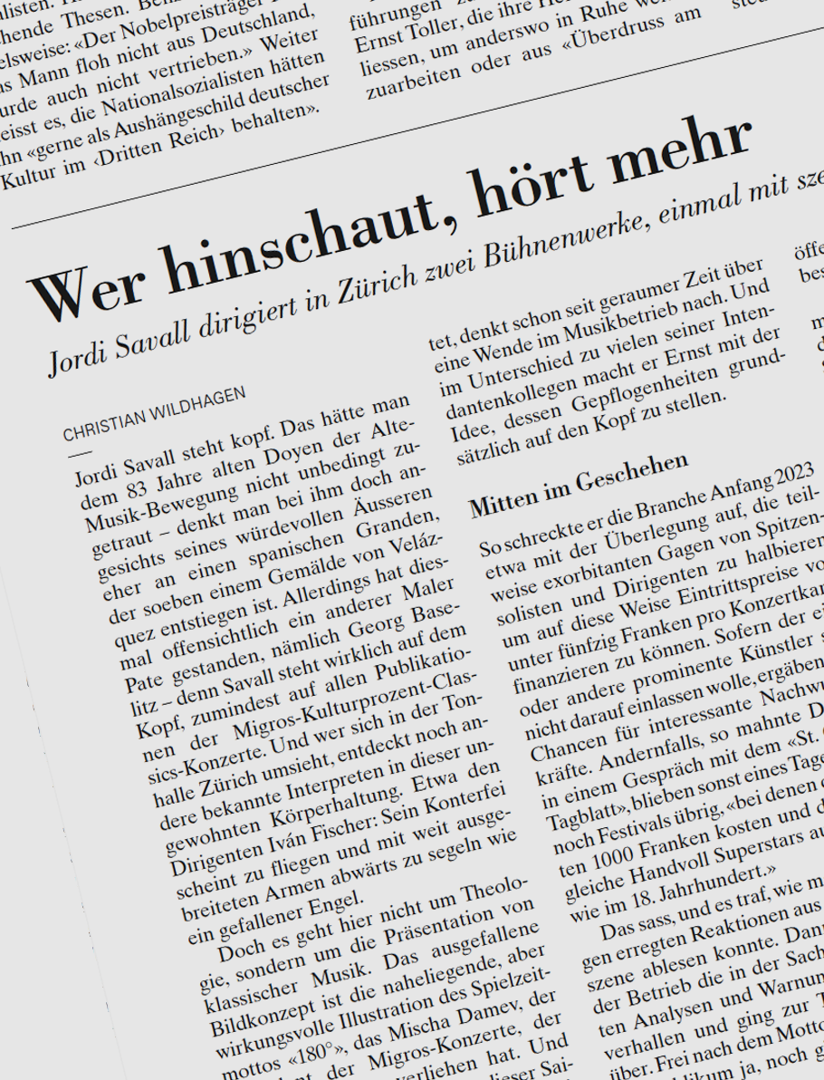 «Das ausgefallene Bildkonzept ist die naheliegende, aber wirkungsvolle Illustration des Spielzeitmottos ‹180°›, das Mischa Damev, der Intendant der Migros-Konzerte, der laufenden Saison verliehen hat.»